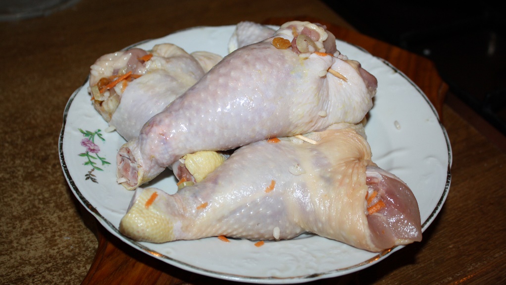 500-600 гр куриных ножек, 150 гр фарша из курицы (или индейки), по 50 гр моркови и репчатого лука, 2 столовые ложки бланшированного риса, 1 чайная ложка коньяка, 1 столовая ложка тертого сыра, 1 зубчик чеснока, 20 гр топленого масла, 20 мл куриного бульона, соль, перец, пряности по вкусу.