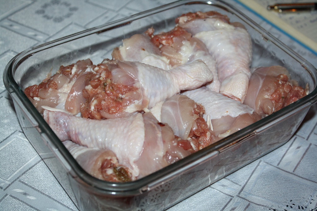 Приготовленным фаршем начинить кармашки ножек, сколоть деревянными шпажками. Далее ножки можно разложить в один слой в сотейник, залить соусом из сметаны и острой томатной пасты и запечь в разогретой до 190*С духовке около часа. Выдержать при выключенном подогреве еще около 20 минут и подавать с гарниром и соусом.