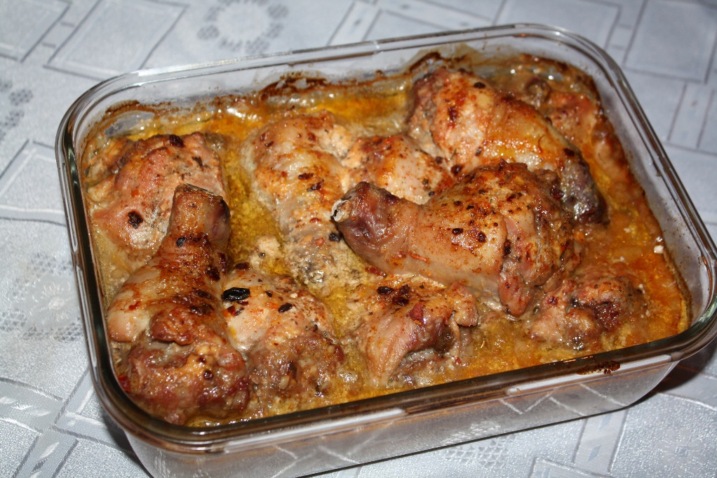 350-400 гр куриных бедер, 50 гр свиного шпика или столько же сливочного масла, 1 столовая ложка красного виноградного вина, 1 столовая ложка манны, 2 зубчика чеснока, 1 стебель зеленого лука, несколько веточек зелени укропа, соль, перец по вкусу, около 50 мл куриного бульона или воды.