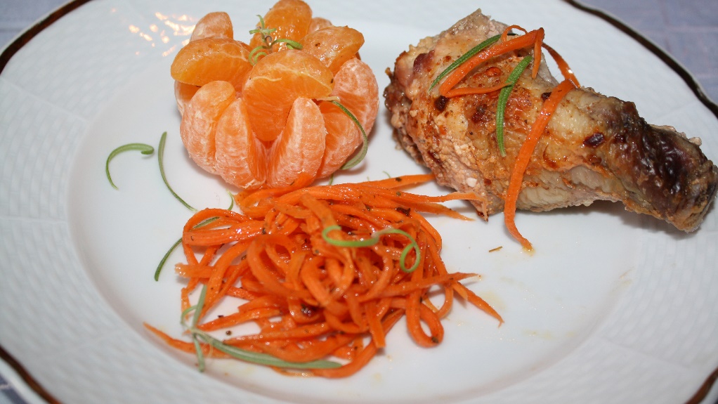 Подавать с горячим гарниром или с овощным салатом и фруктами.