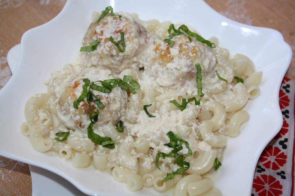 Сформовать из фарша тефтели, разложить в один ряд в низком, широком сотейнике. Сыр натереть на терке для сыра, посыпать тефтели, сверху залить сливками.