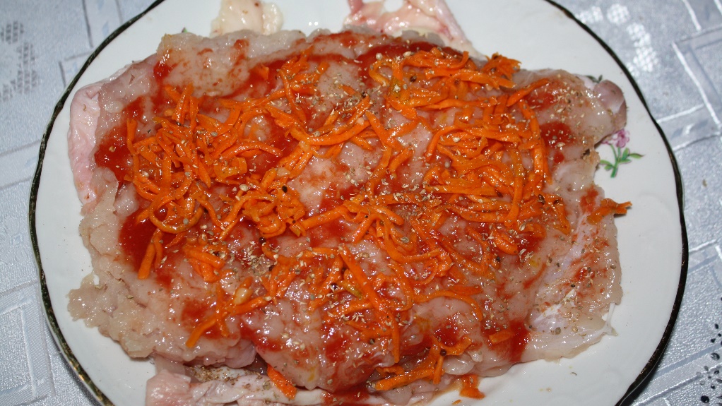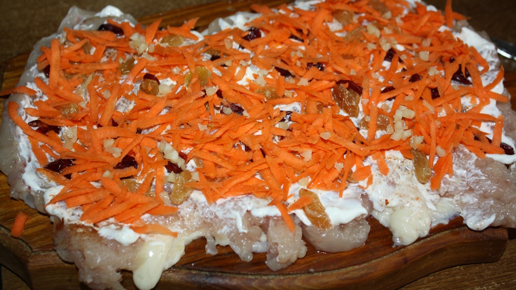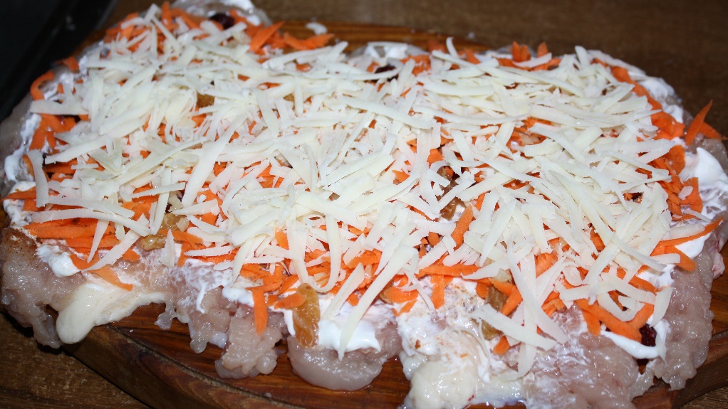 Разложить мясо на рабочей поверхности стола, смазать сливочным маслом и сметаной, посыпать изюмом и чесноком. Ровным слоем выложить на мясо морковь, затем сыр.