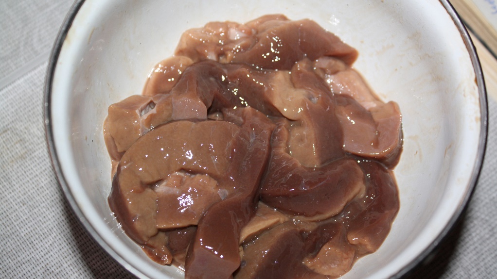 Печенку очистить от пленки, вырезать желчные протоки, залить подсоленным молоком, оставить на 2-3 часа в прохладном месте.
