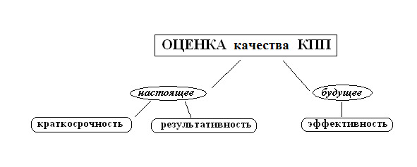 Оценка качества оказываемой помощи также может быть произведена, во-первых, в настоящем – по критериям «краткосрочность» и «результативность» и, во-вторых, в будущем – по критерию «эффективность».