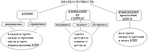Как отмечает В. А. Доморацкий, «краткосрочные направления психотерапии отличаются: 1) экономичностью, 2) технологичностью, 3) индивидуальным подходом… Их основная цель – не выяснение скрытых мотивов, а преодоление актуальных жизненных проблем, включая коррекцию дисфункционального поведения и/или мышления, а также устранение болезненной симптоматики». 6