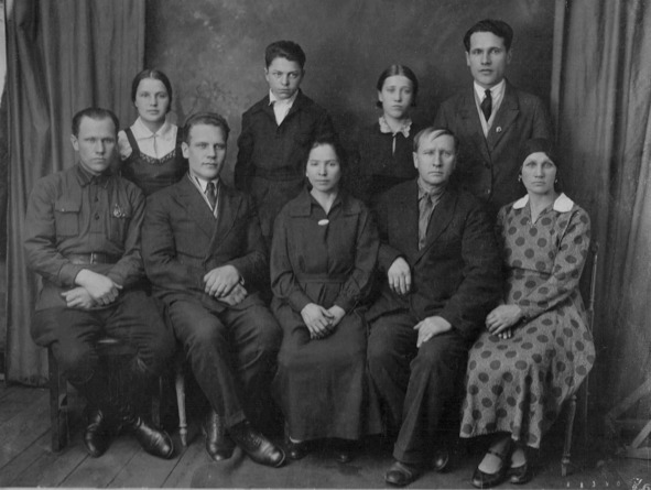 Слева направо: Михаил Николаевич и Варвара Сергеевна (мои родители), Федор Николаевич (мой дядя), Володя и Феня (вторая жена дедушки и ее сын), Нюра (жена дяди Саши), Николай Семенович (мой дедушка), Александр Николаевич (мой дядя), Аграфена Семеновна (сестра дедушки)