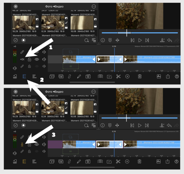Обратите внимание, что после тапа иконочка поменяла свой вид (со стрелки, которая смотрит вправо, на стрелку, которая смотрит вниз. Сама же дорожка обрела фиолетовый окрас – помечено стрелочкой 3). Такая индикация означает, что магнитная таймлиния отключена. Если вы не видите нужную иконку у себя на экране (ту, что помечена стрелочками 1 и 3), просто тапните по иконочке, помеченной стрелочкой 2.