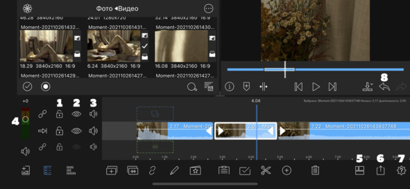Однако работает она только на основной, самой первой видеодорожке. В случае, если вы решите добавить новые фрагменты на дорожки выше, то заметите, что там эффекта магнитной таймлинии нет вовсе. Тем не менее, чтобы отключить ее и на самой первой дорожке, тапаем по иконке, помеченной стрелочкой 1 (см. рис. 15).