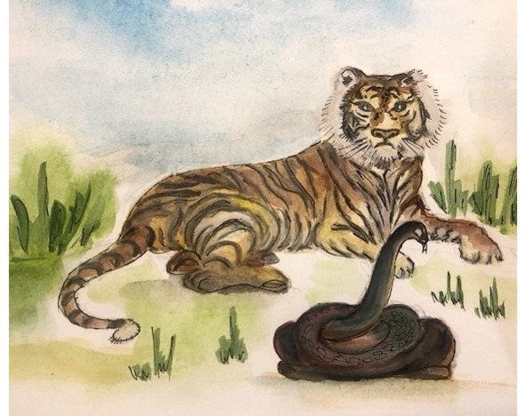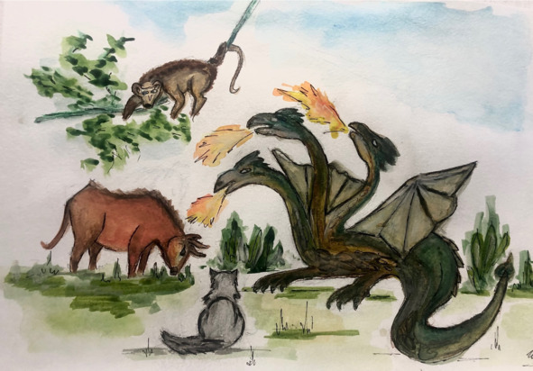 В это время Тигр посмотрел наверх, увидел Дракона, а не увидеть его было невозможно, грозно рыкнул: «Спускайся! Дело есть!» Дракон не стал перечить, а вдруг и впрямь стоящее дело. Сел на землю, сложив крылья. Головы запыхали огнём.