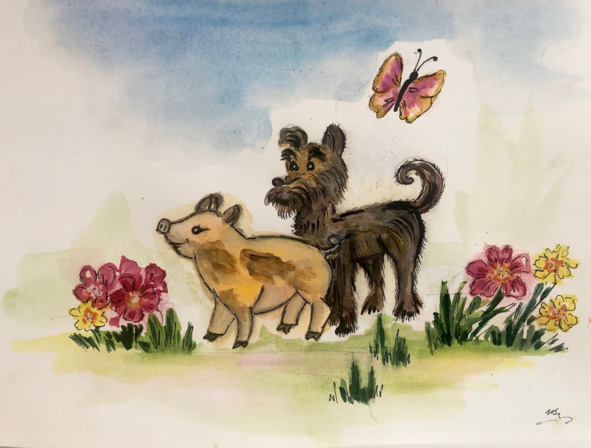 Собачий лай заставил всех повернуться в сторону тропинки. Собака, беспокойная оптимистка, скромная, честная и верная, прибежала вся взмыленная. Вместе с ней бежала Свинья. Они давно подружились, у них был тандем. Добрая, услужливая до крайности, Свинья очень уважала Собаку. Вот они никогда и не расставались.