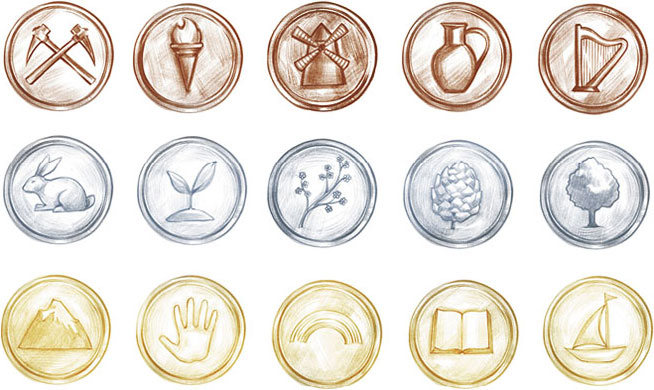 На экране за спиной Алехина появились фотографии монеток-жетонов с подписями. Саша сразу узнала ту, что получила от Юноны Эдгаровны на своем нулевом уроке рисования, – медную, с двумя скрещенными кирками. В одном ряду с ней было еще четыре: с зажженным факелом, с ветряной мельницей, с кувшином и с арфой.