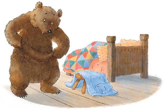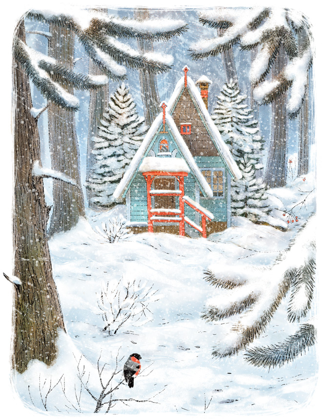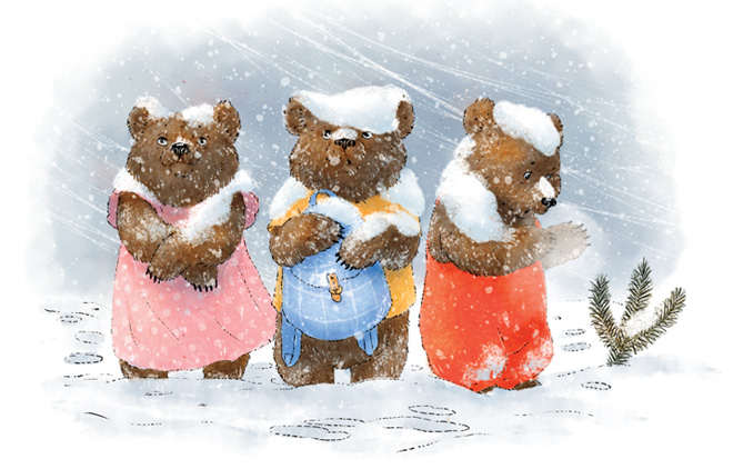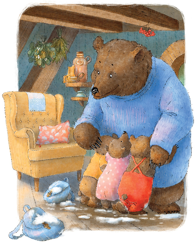 Густав в полусне выбрался из кровати, зевнул и потянулся. Потом он протопал к двери и отодвинул засов. Снаружи стояли три белых медвежонка, с головы до пят покрытые снегом, и дрожали от холода. Они попытались что-то сказать, но зубы у них так стучали, что Густав не разобрал ни слова.