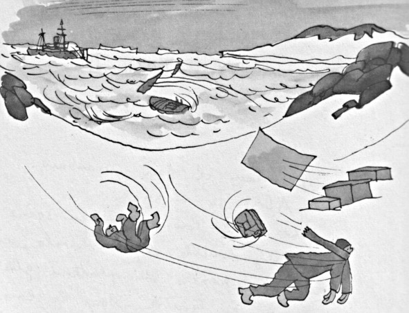 В первые дни ветры дули с берега, они иногда достигали силы 20 метров в секунду, но большой волны не разводили и не препятствовали выгрузке и работам.