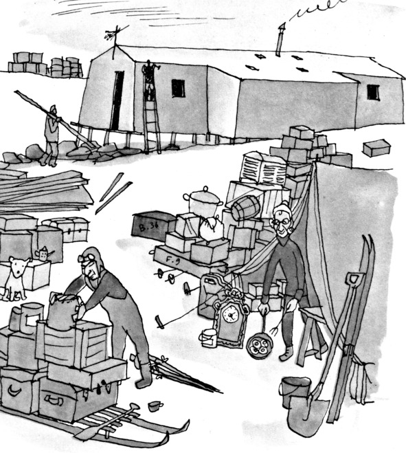 Домики – это набор стандартного размера щитов, из которых можно строить здания любого размера и любой конфигурации. Щиты соединяются друг с другом болтами, каждый щит состоит из двух листов бакелитовой фанеры, пространство между ними заполнено пористым, почти невесомым теплоизоляционным материалом – пенопластом. Из таких щитов в последние годы строятся домики на дрейфующих станциях. Только там они ставятся на полозья, а здесь – на неподвижный фундамент. В отличие от дрейфующего льда здесь никаких разломов под сооружениями не ожидается. Из деревянных брусьев и досок решено построить просторные тамбуры между домиками, которые будут служить переходами из одного помещения в другое, а также раздевалками и складами.