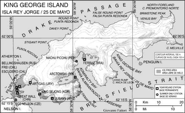 Island King George (Ватерлоо) – самый крупный острова архипелага Южные Шетландские острова. Открыт Уильямом Смитом в 1819 году. King George – это остров ветров и туманов. Небо над островом постоянно покрыто низкими облаками, плотные туманы, мокрые снегопады, дожди и сильные ветры, приносящие зимой свирепые ураганы – все это обычные явления для этого отдаленного живописного уголка нашей планеты.