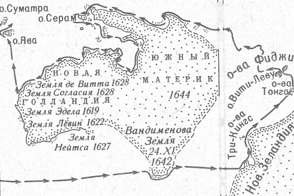 К началу 40-х годов XVII века голландские моряки открыли и нанесли на карты со стороны Индийского океана западные, юго-западные и частично северные берега огромной земли, которую назвали Новой Голландией.