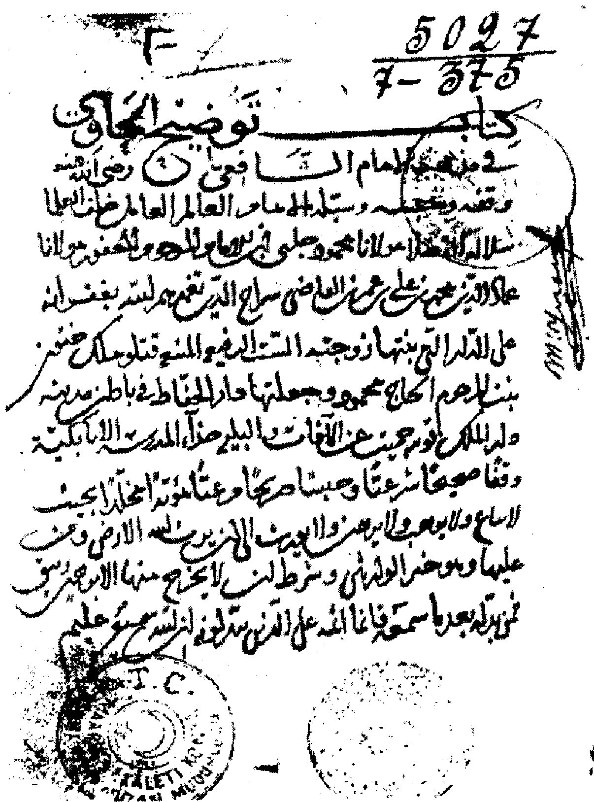 (Konya Yusuf Ağa Kütüphanesi no. 4812, yp. la) Kadı Siraceddin el-Urmevî’nin ahfadından Mahmud Çelebi’nin kızı Kutlu Melek Hatun’un Konya’da yaptırdığı Dârü’l-Huffâz’a vakfettiği Tavzihü’l-hâvf adlı eserin kapak sahifesindeki vakıf kaydı.