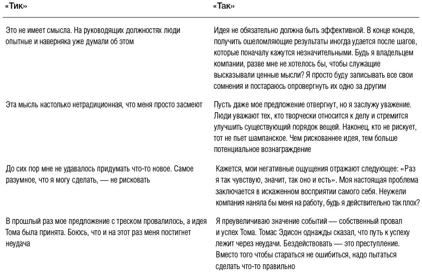 Ниже следуют два примера выполнения упражнения «Тик-так». Первый связан со страхом высказывания новой идеи начальству; второй – с опасениями перед выпуском новой продукции.