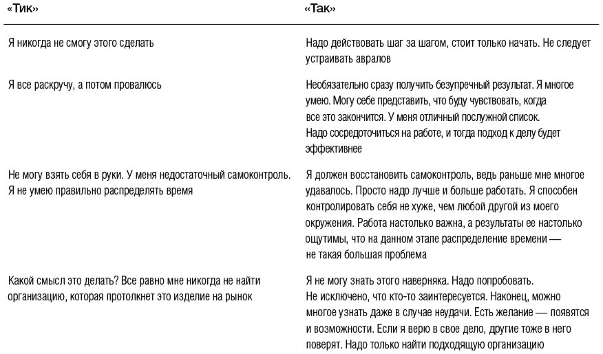 «ТИК-ТАК»Это очень действенное упражнение, базирующееся на работах Прескотта Лекки. Оно помогает преодолеть страх, сомнения и неуверенность. Вам предлагается записывать свои страхи, открыто противостоять им и заменять их на позитивные мысли, которые помогут добиться успеха.