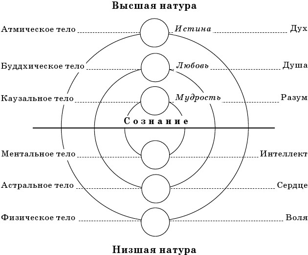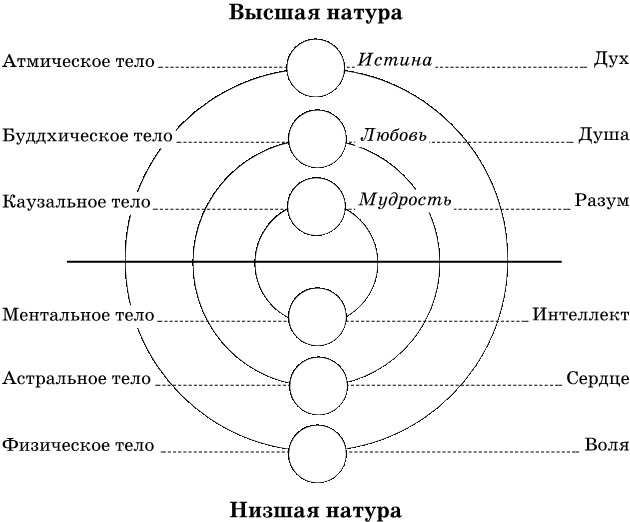 Теперь вы понимаете, почему нужно говорить не об одной человеческой натуре, а о двух – высшей натуре и низшей, которые имеют те же самые способности думать, чувствовать и действовать, но в двух противоположных направлениях. Этот рисунок прольёт вам свет на вопрос о двух натурах, каждая из которых представляет три деления, соответствующие трём функциям человека: интеллекту, сердцу и воле или же – мысли, чувству и действию. Каждая из этих функций обладает местопребыванием, проводником или также говорят «телом», через которое она выражается. В той части, которая представляет низшую натуру, мы видим тела: физическое (воля), астральное (сердце) и ментальное (интеллект), а для высшей натуры – тело каузальное (высший интеллект или разум), буддхическое (высшее сердце или душа) и атмическое (высшая воля или дух).