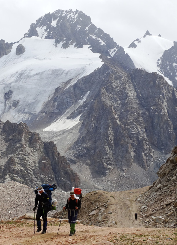 After Mynzhilki – a small alpine decline,, the road begins to rise onto the chaotic pile of stones of the huge moraine Tuyuksu. And from there, you can see a beautiful alpine panorama that worth looking at. This is the peak of Great Patriotic War (4050 m), Antikainen (4000 m), Panfilov Heroes (4120 m), Pioneer and Teacher (we have seen them from Bogdanovich glacier) and Amangeldy peak (3999 m).