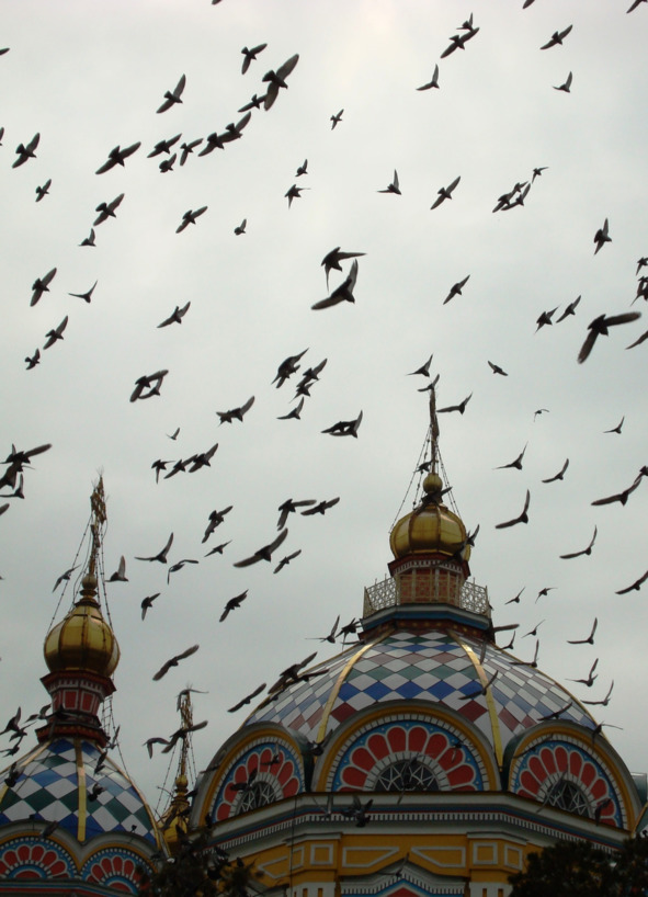 Here, to one and the same permanent cooing and flickering wings flapping, time goes in different manner than at any other place. Time goes slowly here. And if there is some peculiar Almatynian rite of passage, connecting such different peoples and such unlike generations that inhabited and are inhabiting our city, then it performs right here, in the shadows of the temple.