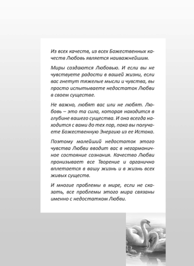 Из всех Божественных качеств качество Любви является наибольшим. Стремление к любви, желание любить и быть любимым присуще всем живым существам. И именно из-за нарушения Божественного Закона вследствие злоупотребления свободной волей, именно в это главнейшее качество внесены наибольшие искажения.
