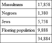 From a document of 1621 one learns that Algiers had a population of 100,000 in 1553, a half a century later 150,000, and in 1621 200,000. Then came the decadence; and, at the coming of the French in 1832, Algiers was but a city of 34,000, Moors, Turks, Jews, Negroes, and Arabs all counted.