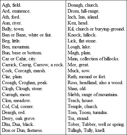 It is well to recall that the mass of the Irish people speak the English tongue alone, a tenth part, perhaps, being able to speak both Gaelic and English, with but a very few who know Gaelic alone. In the south and west the latter is much more spoken than in the north and east, where it is fast disappearing. The Irish Gaelic, or Erse, resembles both the Scottish and the Welsh Gaelic. Some common words frequently met with in travelling about Ireland are:
