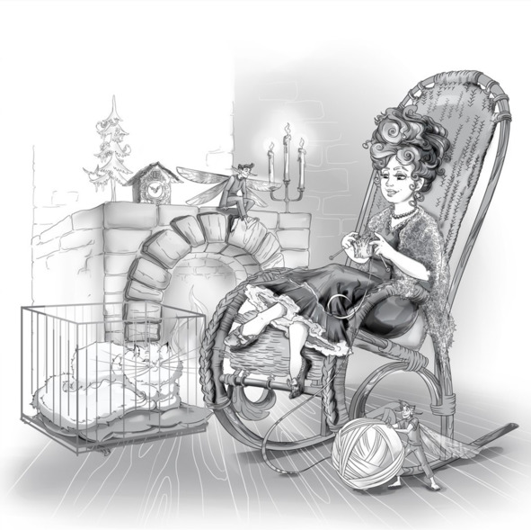 Дверь была немного приоткрыта. Элина приблизилась к дверному проёму и заглянула внутрь. Её взгляду открылась удивительная картина: в круглой комнате размером с три детских комнаты Элины, освещённой похожей на птичье гнездо люстрой с десятком маленьких свечей, возле пылающего камина в кресле-качалке сидела женщина лет пятидесяти пяти. Она была совсем невысокого роста, даже немного ниже Элины, в чём девочка смогла немного позже убедиться. Её улыбающееся лицо сразу внушило Элине симпатию: румяные круглые щеки, аккуратный носик и ярко-зелёные глаза. Рыжие кудрявые волосы были собраны в пышный пучок на макушке. Пухлыми ручками женщина быстро-быстро перебирала две серебряные спицы с нанизанной на них белой пряжей. Внизу, ловко уворачиваясь от качающихся ножек кресла, сновали туда-сюда очень похожие на Астона зелёные человечки, помогая себе для увеличения скорости прозрачными крылышками. Человечки разматывали пряжу и подносили новые клубки. Элина легко узнала в них братьев Астона, так они были похожи. Неподалёку от камина, на безопасном расстоянии стояла клетка, в которой на высокой красной подушке спал огромный белоснежный кот. Возможно, именно его шерсть послужила материалом для изготовления пряжи. Кот широко зевнул, обнажив ряд острых белых зубов и шершавый розовый язык.