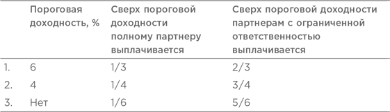 В. Разделение прибылей между партнерами с ограниченной ответственностью и полным партнером: первые 6 % в год – партнерам с начала размещения капитала на рынке; из того, что сверх этого, одна четверть – полному партнеру, три четверти – всем партнерам пропорционально их капиталу. Любая нехватка прибыли, когда она меньше 6 %, относится на прибыли будущих периодов, но не может относиться на прошлые периоды. В настоящее время существуют три варианта разделения прибылей, предлагаемые новым партнерам на выбор: