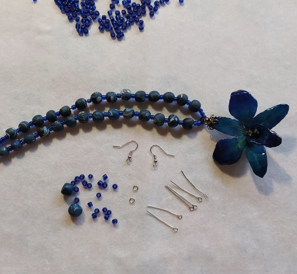 Итак: для изготовления колье с цветком понадобятся пассатижи, круглогубцы, бокорезы, тонкий шнурок, два крепежа, три соединительных кольца, одна застёжка, одна цепочка-удлинитель длинной в 5 см, пакет синего крупного бисера, бусины из полимерной глины и сам цветок в смоле.