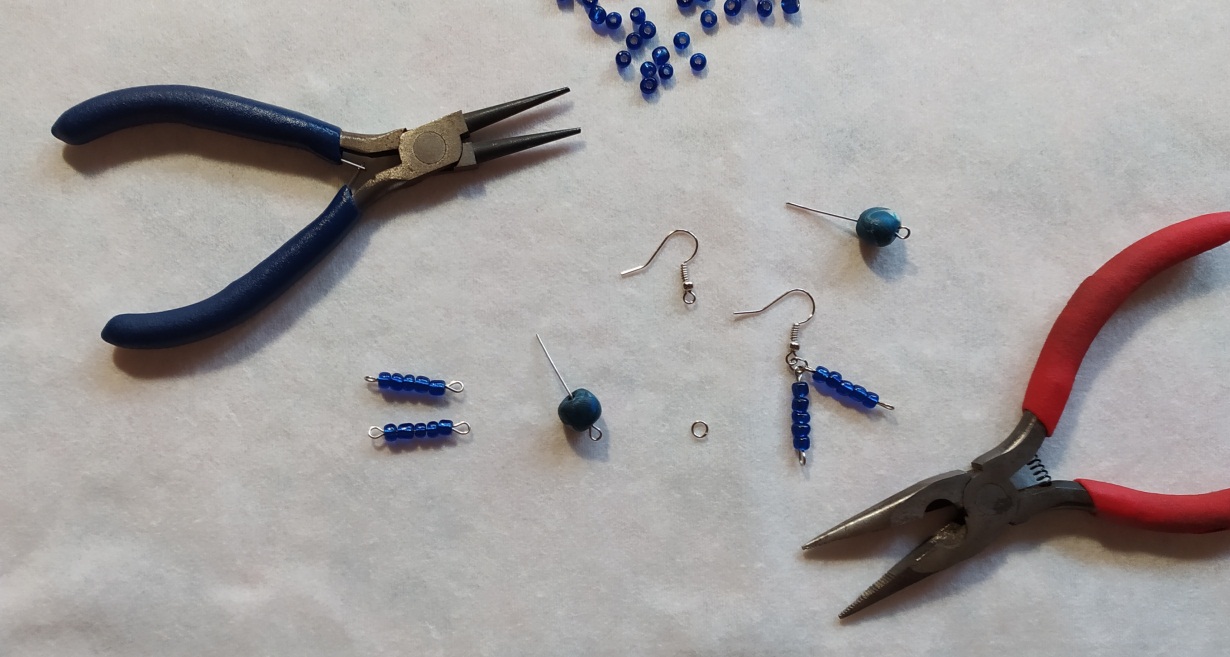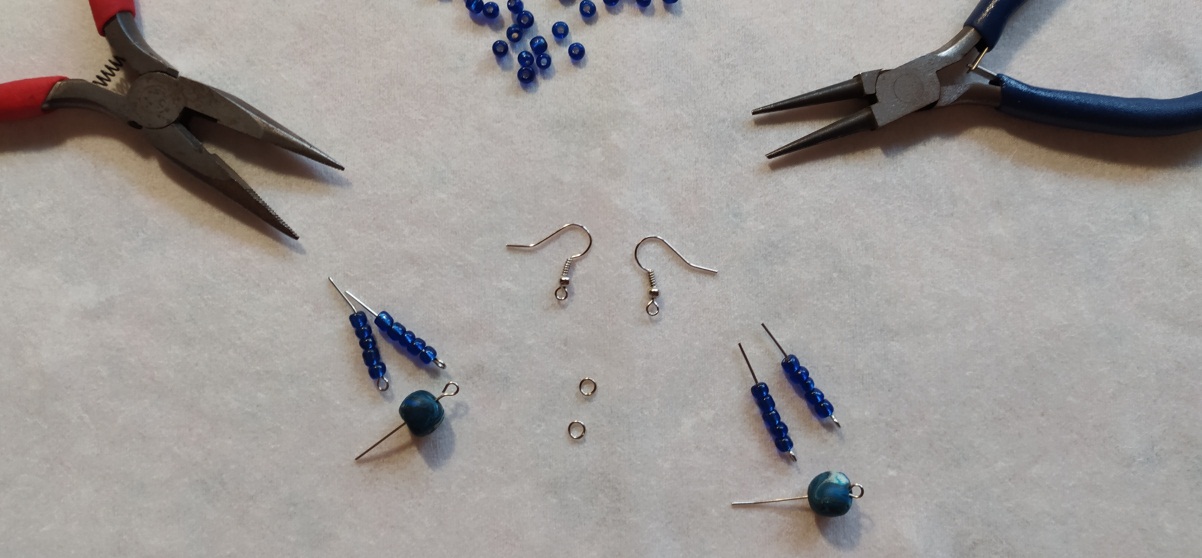 Для этого мне понадобились дужки, пины с плоским наконечником, шапочки для бусин, металлические шарики. Из инструментов пассатижи и круглогубцы.
