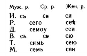 Откроем грамматики59 древнерусского языка и пристально вглядимся в парадигму указательного местоимения сь, сѥ, си: