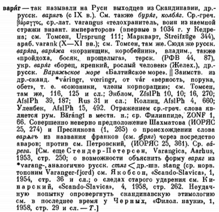 И что?! Так уж очевидно теперь утверждение Томсена, будто в слове «варяг» – корень var-? Из чего следует подобный вывод норманнистов как научно-идеологических последователей Томсена?! У них что, образование не позволило закончить среднюю школу?! Так нет же, с образованием у них всё в порядке. И по своей начитанности дадут фору любому. Наука, как видится, здесь вовсе ни при чём!