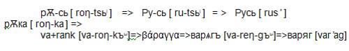 Примеров не счёсть, и в том ряду место чередованию слов «варяг» (варѧгъ) – «русь» (рѫсь), восходящих к корнеслову *rǫka (ranka).