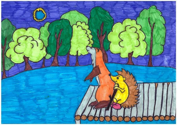 По вечерам Хорёк и Ёжик часто встречались возле большой старой сосны с огромным дуплом, которая растёт на окраине Берёзового Леса недалеко от обрывистого берега Тихой Реки. Они гуляли, делились своими впечатлениями об увиденном и услышанном и рассказывали друг другу придуманные ими истории. Ходили на речку и, молча, сидели на берегу, глядя на воду, а ещё они любили смотреть на голубую звёздочку, которая всегда сияла над лесом и притягивала их взоры своим таинственным голубоватым светом. В тот вечер они также сидели на берегу у самого края воды. Ёжик загадочно смотрел в небо, а Хорёк чертил веткой на воде замысловатые фигуры.