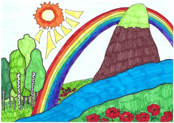 Весь день моросил надоедливый дождик. Ближе к вечеру распогодилось, и из-за туч показалось и прочно заняло своё место оранжевое Солнце. Нежное, мягкое, как будто оно только что проснулось и, позёвывая, протирало свои глазки. Небо очистилось от облаков, и на голубом фоне появилось самое красивое творение природы: радуга – воплощение всех цветов на земле.