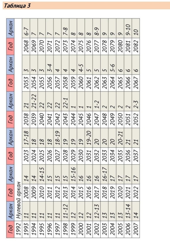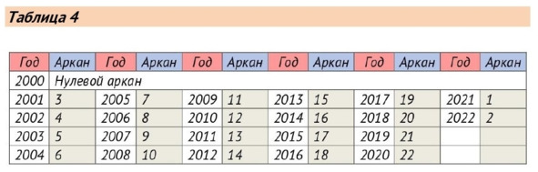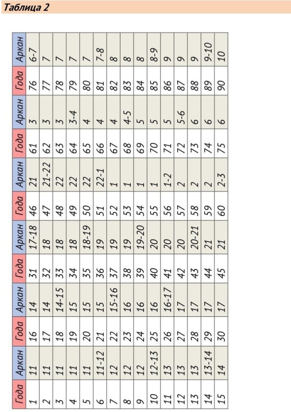 Обратите внимание, что во второй и третьей таблице в одной ячейке иногда попадаются два аркана. Это переходящие года. В этом случае более подробно необходимо смотреть таблицу с первым вариантом, т. е. первую таблицу.