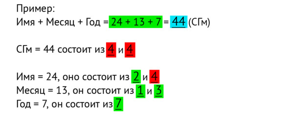 Для того, чтобы найти судьбоносные года, нам необходимо взять СГг и СГм (смотря что вы считаете) и внимательно посмотреть, из каких цифр этот показатель состоит. Т. е. мысленно мы это число отделяем на независимые цифры. То же самое мы делаем с итоговым значением Имени, Года и Месяца. Далее цифры из СГг и СГм сравниваем с Именем, Месяцем и Годом. Если попадутся одинаковые цифры, то это признак судьбоносного года или месяца. Не переживайте, разберем подробно на нашем примере.
