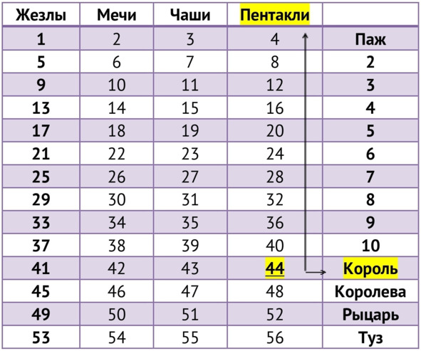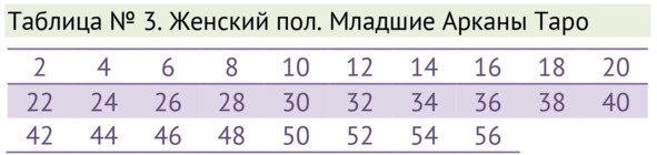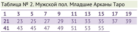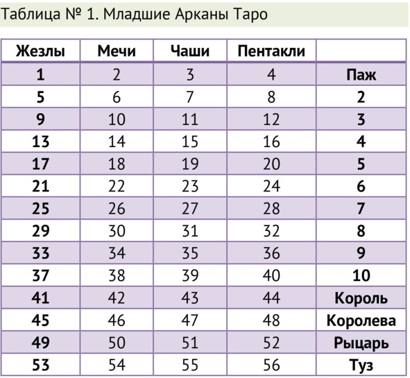 Далее в таблице №1 необходимо найти это число. Обратите внимание, к какой стихии и к какой придворной карте или аркану относится наш результат.