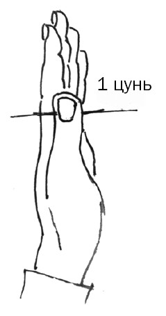 1 цунь – это ширина большого пальца левой руки (у мужчин) по линии, проходящей через угол ногтевого ложа (рис. 1). У женщин можно использовать для измерения обе руки, если род занятий не провоцирует уплощение правого пальца (как прядильное ремесло, например).