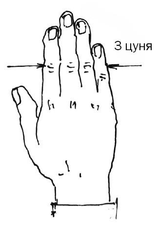 3 цуня – ширина 4 сомкнутых пальцев выпрямленной (правой или левой) ладони (рис. 2).