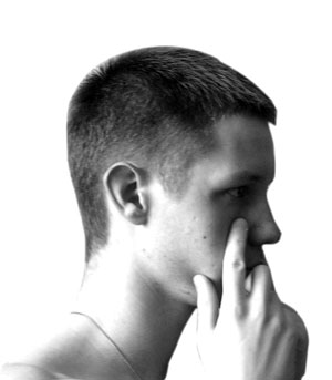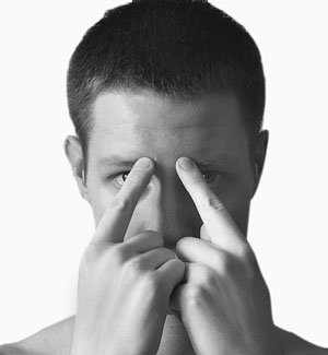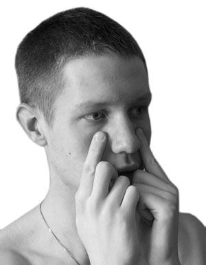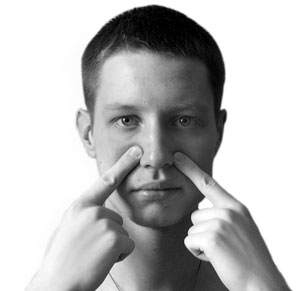 Надавливают симметричные возбуждающие точки у наружных уголков глаз (фото 7). Затем симметричные успокаивающие точки под глазами, по ходу гайморовых пазух (выступающие кости лица – фото 8). По 1 минуте легко указательными пальцами синхронно надавливается каждая пара точек. Последовательность проведения: сверху-вниз. Акупунктура поможет и в случае разразившегося насморка, и как профилактическое средство.