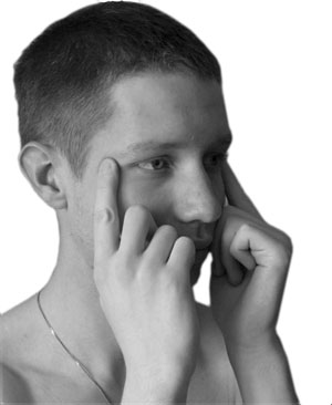 Используются симметричные гармонизирующие точки над внутренними концами бровей (фото 1). Затем прикройте глаза и массируйте симметричные возбуждающие точки у наружных уголков глаз (фото 2). Затем симметричные успокаивающие точки под глазами, по ходу гайморовых пазух (выступающие кости лица – фото 3). Затем симметричные специальные точки у крыльев носа (фото 4).