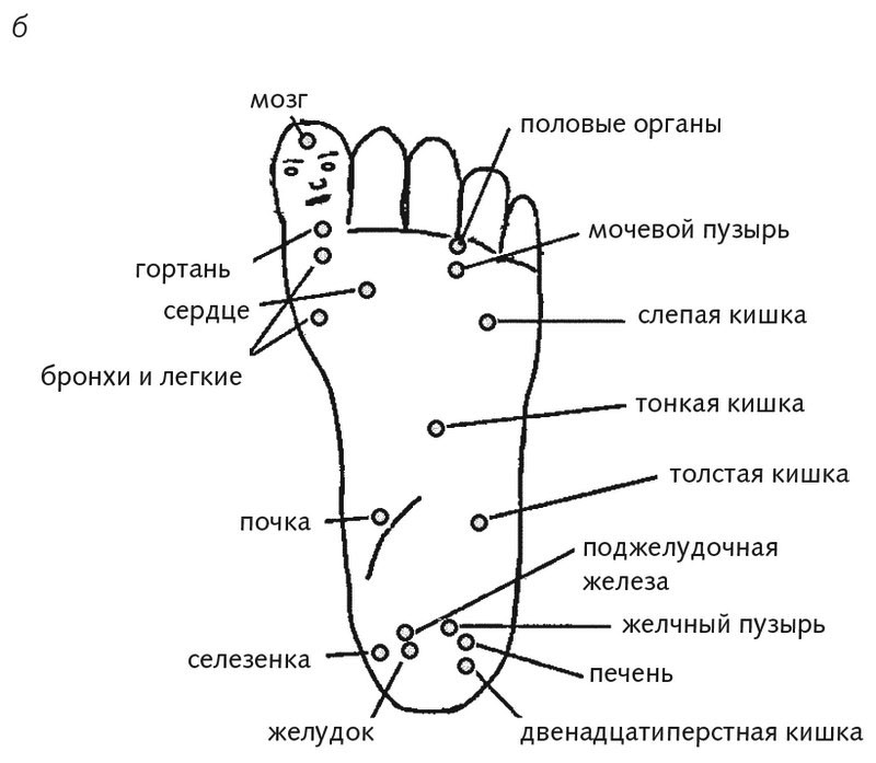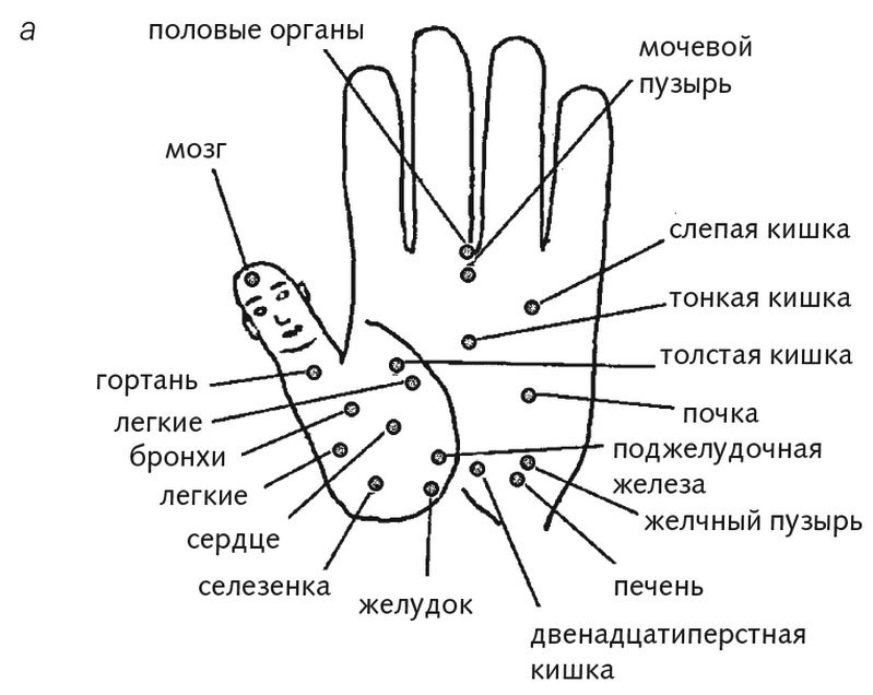 Обратите внимание на Атласы главных точек внутренних органов на ладони и на стопе (рис. 4, а, б). Каждый орган имеет выход на стопу и ладонь в определенных областях и реагирует на прикосновение к ним.