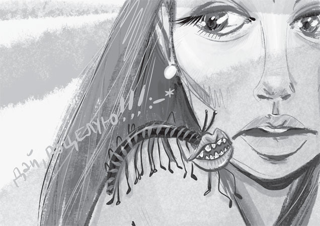 Сны снились тревожные, в них они были с Димой, но потом налетал дракон и откусывал ей голову. В другом по ней ползла крупная сороконожка с человеческими губами и пыталась её поцеловать.
