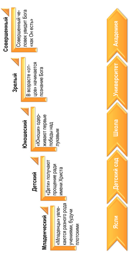 Результаты, которые человек достигает на каждом духовном этапе, показаны на рис. 3. Младенцы охарактеризованы как плотские, которым свойственно увлекаться «всяким ветром учения» (1 Кор. 3:1; Еф. 4:14). «Детям» прощены грехи ради имени Христа. «Юноши» победили лукавого. В зрелом возрасте «отцов» начинается познание Бога, которое достигает полноты в совершенном возрасте Христовом: «Мы теперь дети Божии, но еще не открылось, что будем. Знаем только, что, когда откроется, будем подобны Ему, потому что увидим Его как Он есть» (1 Ин. 2:12—14, 3:2—3; Еф. 4:13). Эти результаты отражают не только приобретенные практические духовные навыки, но и определенные теоретические знания. Не случайно Бог провел аналогию между духовными возрастами и учебными заведениями (ясли, детский сад, школа, университет, духовная академия), что также нашло отражение на рис. 3.