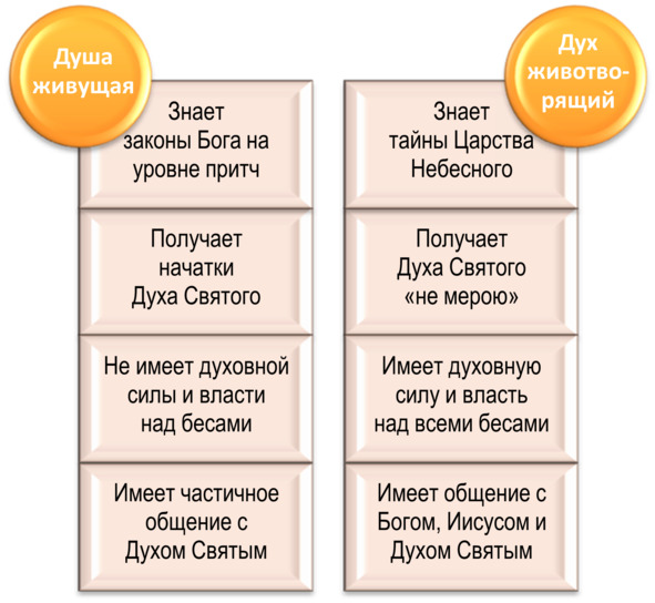 Пройдя путь взросления от младенчества до совершенства, душевный человек становится духовным. Первый человек Адам не был духовным, он был душевным. Бог открыл, что начатки духовности появляются в человеке только по достижении середины юношеского духовного возраста. Человек, достигший хотя бы юношеской стадии в юношеском духовном возрасте, «оживает духом» после смерти подобно Христу, пополняя армию святых на небе: «Христос, чтобы привести нас к Богу, однажды пострадал за грехи наши, праведник за неправедных, быв умерщвлен по плоти, но ожив духом…» (1 Пет. 3:18). Эти святые сразу по воскресении включаются в работу по воспитанию новых поколений святых, что происходило и происходит на всех этапах реализации Божьего плана спасения рода человеческого (см. рис. 1).