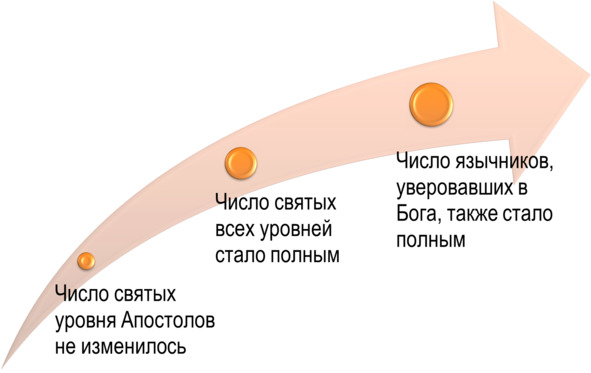 Из рис. 5, отражающего результаты Церкви, видно, что духовного уровня первых двенадцати учеников Христа, в будущем Его Апостолов, не достиг больше никто из тех, кто жил на земле после них. Вместе с тем, как уже было отмечено при рассмотрении третьей тайны, шел поступательный процесс подготовки святых. Их число на небе должно было стать «полным», то есть достаточным для того, чтобы «совершение» (или подготовка) святых на земле могла приобрести массовый характер: «…я увидел под жертвенником души убиенных за слово Божие и за свидетельство, которое они имели. И возопили они громким голосом, говоря: доколе, Владыка Святый и Истинный, не судишь и не мстишь живущим на земле за кровь нашу? И даны были каждому из них одежды белые, и сказано им, чтобы они успокоились еще на малое время, пока и сотрудники их и братья их, которые будут убиты, как и они, дополнят число» (Откр. 6:9—11). При этом из поколения в поколение увеличивалось число Христиан младенческого и детского возраста, а число язычников, приобщившихся к Церкви, тоже достигло своей полноты, как и число святых: «…ожесточение произошло в Израиле отчасти, до времени, пока войдет полное число язычников» (Рим. 11:25).